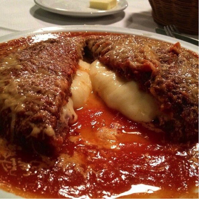 You would be forgiven for thinking this is a space ship from another planet. No, it’s just the legendary Polpettone which is an enormous meatloaf disc stuffed with cheese and smothered with a beautifully seasoned tomato sauce. Descended from Italy, this Italian meatloaf is out of this world. The chef arrives at 6:30am to prepare 500 of these daily.