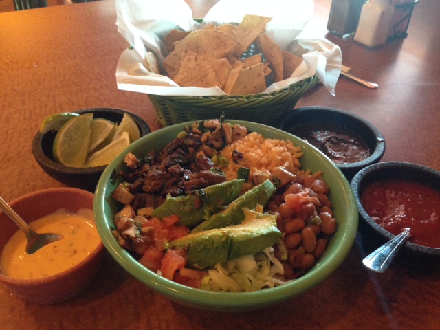 Recommended order (Las Palapas): Taco Norteno (steak, cheese and avocado in a grilled flour tortilla) and Las Palapas’ Super Bowl (choice of al carbon, chicken fajita or guisada, drizzled with queso dip and rice, charro beans, lettuce, tomatoes and sliced avocado.). When the waiter brings you complimentary chips and salsa, be sure to ask for roasted salsa, too.